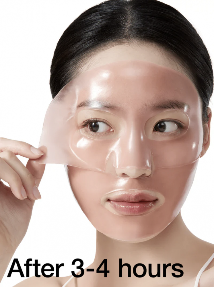 After cleansing, toning, and applying serum, separate the hydrogel base of the mask from the protective film. Place both parts of the mask on your face, smooth them out, and press lightly. Leave the mask on for 3-4 hours. Once the essence has been absorbed and the mask has become transparent, it can be removed. Distribute any remaining product over the skin with light massage movements. The product can be applied overnight.