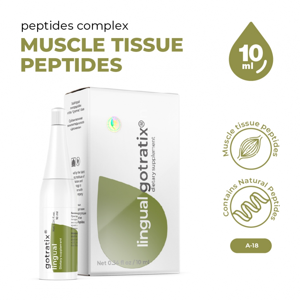 Содержит комплекс пептидных фракций, полученных из трехглавой мышцы. Выделенные пептиды обладают избирательным действием на миоциты, нормализуют их метаболизм и повышают их функциональную активность.